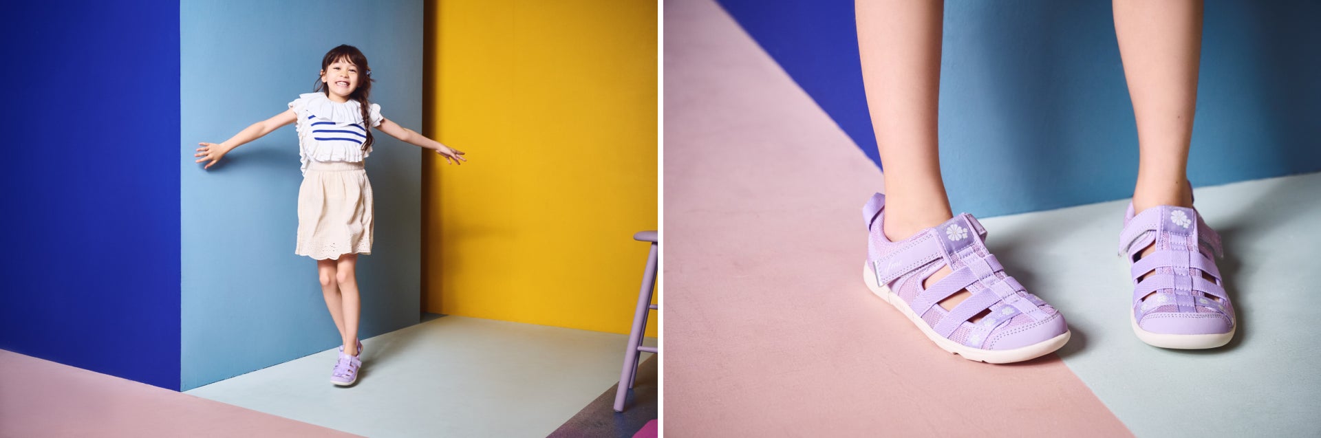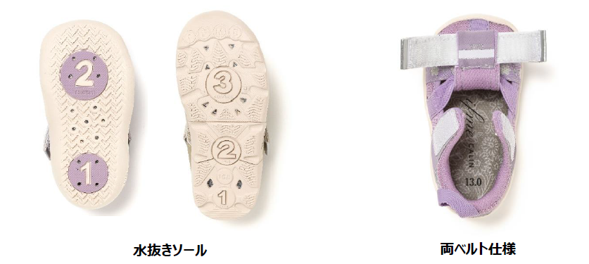 さらに、つま先を覆うアッパーにより、サンダルにありがちな指先のケガを防ぎ、子どもたちの水場遊びをサポート。両ベルトタイプを採用しているため、履き口が大きく開き、濡れた足でも簡単に脱ぎ履きできる一方で、着用時は左右のそれぞれのベルトがしっかりとホールドし、遊んでいても脱げにくい仕様となっています。