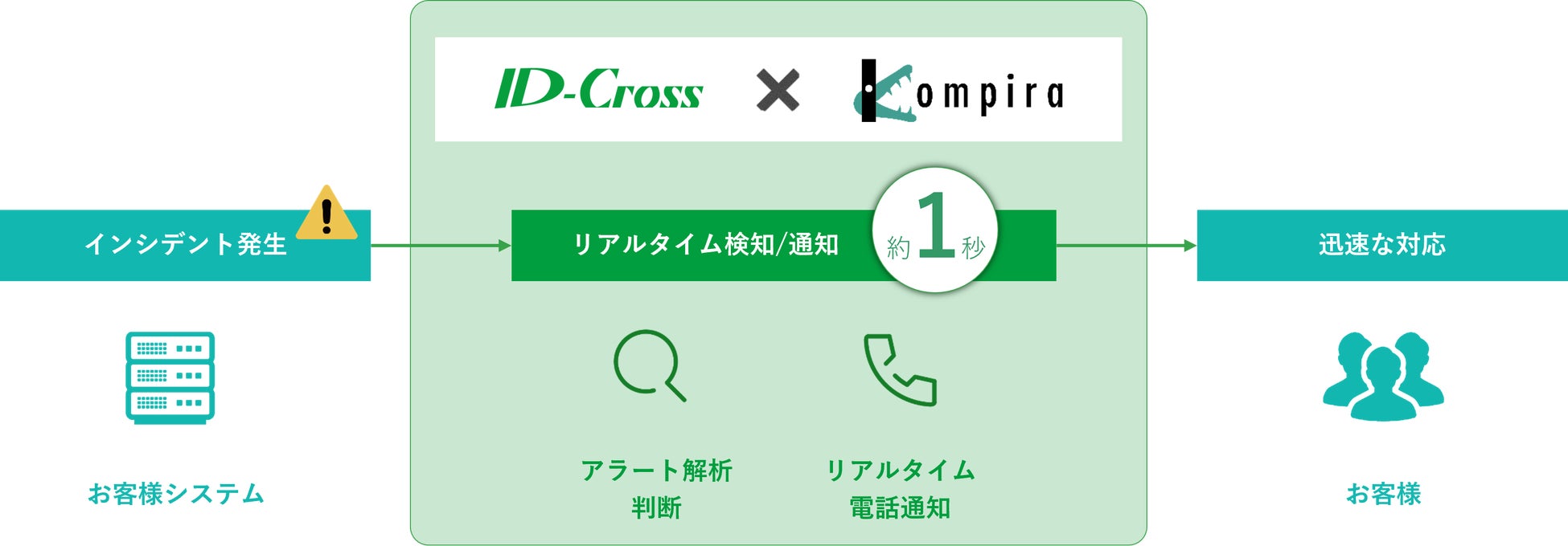 従来の重要アラート電話通知サービスや、個別にご提供しておりましたインシデント対応サービスは、人的対応の為、インシデント発生時よりお客様のご担当者様への電話通知までに約15分を要していました。Kompiraシリーズ採用後は自動音声の電話通知にて、わずか約1秒(※)でお客様にご連絡いたします。
