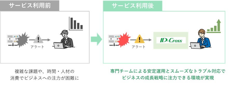 当社のID-Crossは、お客様のIT経営を24時間365日支えるサービスです。50年以上に渡り蓄積された運用設計のナレッジをベースに、お客様に寄り添ってクラウド環境のインシデント監視やシステム運用の作業を代行します。お客様のご要望に柔軟にお応えするため、日々進化し続けるAI技術も活用しながら、業務の効率化・生産性の向上を続けています。