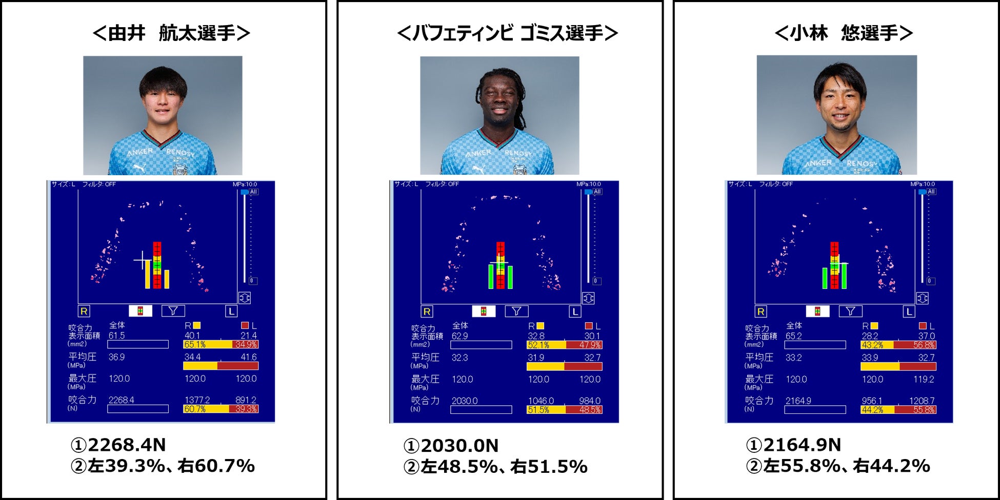 川崎フロンターレの選手を対象に、デンタルプレスケールⅡという器具を使用して、咬合力と左右のバランスを測定、自身の噛むチカラを可視化しました。20~30代男性35名を対象に測定した平均咬合力が1484.3N※という結果の中、3名もの選手が脅威の2000Nを超える結果となりました。咬合力が一番強いのは由井選手という結果に。由井選手は「自分の咬合力が強いことがわかりました。1日でも早くピッチに立って、サポーターの皆さんの前でプレーできるように頑張ります」とコメントしました。噛むチカラ測定を実施した選手たちからは「スポーツは噛む力が大切なため、自分の咬合力や左右の噛むバランスなど自分の状態を知ることができてよかったです」といった感想が寄せられました。安藤選手からは「試合前にガムを噛んでリラックスして試合に臨み、勝ち試合をみなさんに見せられるようにしたいです」とサポーターに向けてのメッセージをいただきました。
