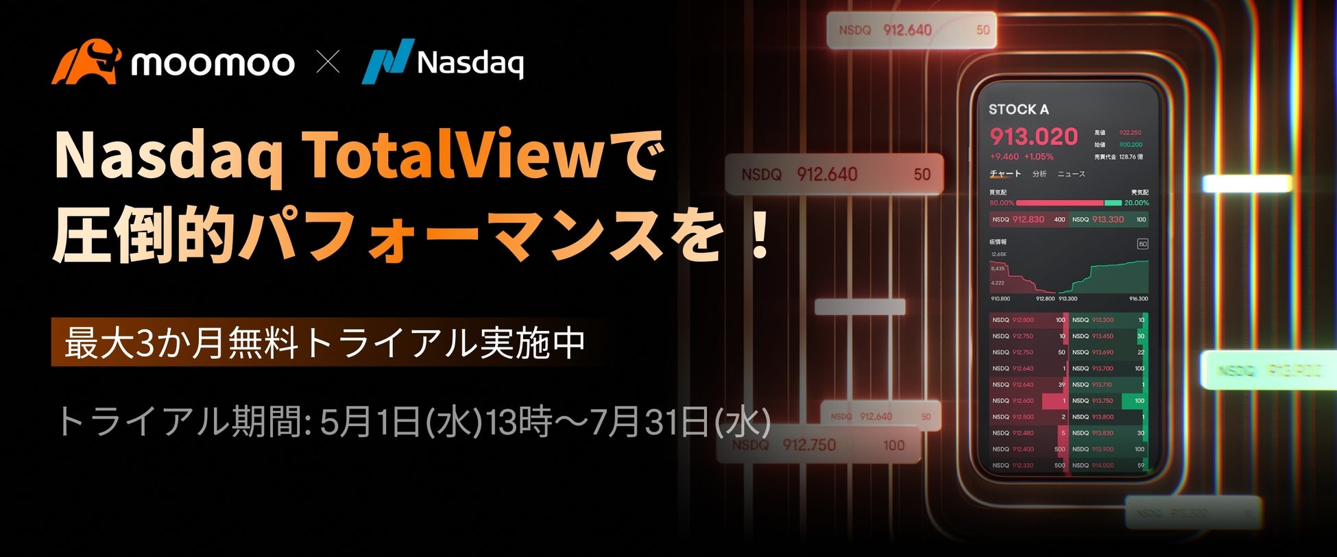 今回の提携を記念して、moomoo はプレミアム・データソリューション「Nasdaq TotalView®」を3ヶ月無料でお試しいただけるキャンペーンを実施します。moomooとNasdaq は、Nasdaq TotalView®によって、個人投資家の分析や取引が向上することを願っています。