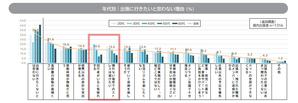 また、「同行者がいると気疲れする」「慣れない場所でのストレスは避けたい」などの理由では、若年ほど高い傾向。