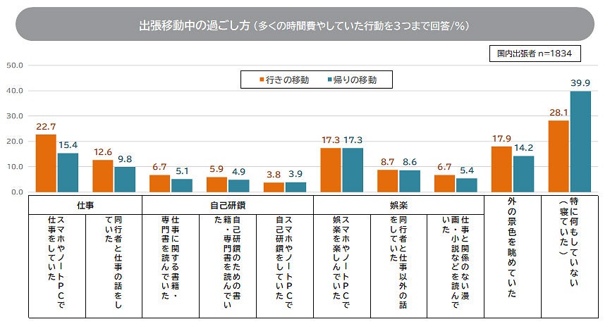 5. 出張移動中の過ごし方を行きの移動/帰りの移動それぞれで見た。行き/帰りともに「特に何もしていない(寝ていた)」が最も多く、帰りの移動で特に多い。また、行きの移動では「スマホやノートPCで仕事をしていた」割合が高い。