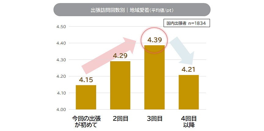 ただし、地域への愛着は訪問3回目でピークとなり、この間に有効な地域とのつながりを結べなかった出張者の愛着は、その後薄れていく傾向が確認された。その際、地域とのつながりを媒介する《つなぎ役》の存在は重要であり、《つなぎ役》として期待される人物には、ほがらかな人柄、ないしはビジネスを促進し得る知見を有するなどの特徴が示唆された。