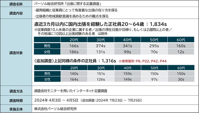 本調査では、企業などにおける出張業務に着目し、組織と個人、そして出張先の地域にとっての副次的な効果について確認し、組織と従業員にとって有意義な出張の在り方、出張者の地域貢献意識を高めるための観点などを探ることを目的に実施しました。
