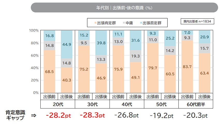 出張への意識をみると、出張前・後のいずれのタイミングでも、出張を肯定的にとらえる割合は若年層で低い傾向。また、出張前⇒出張後の意識変化(肯定意識の落差)は、若年層で大きい傾向。
