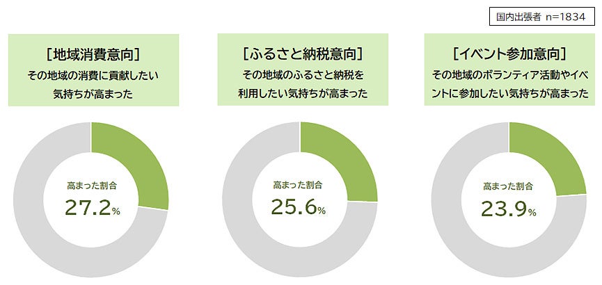 調査結果では、交通費を除き一時的な滞在費として平均34,284円(支出総額62,216円-交通費27,932円)を支出しており、出張を通じて地域における消費やふるさと納税、イベント参加などに対する意識が高まったと述べる出張者が2割弱確認された。さらに、出張者は業務終了後の飲食・娯楽を通して地域住民と交流することで、地域への愛着が高まることが示唆された。