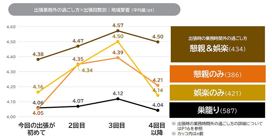 12. 出張先への訪問回数と地域愛着の関係性について、出張業務外の過ごし方別に比較した。「巣籠り」群では、回数によらず地域愛着の高まりは低い。「娯楽のみ」群と「懇親のみ」群では、4回目以降の下落幅が大きい。「懇親&娯楽」群では4回目以降の下落幅は比較的小さく、高い水準で推移している傾向。