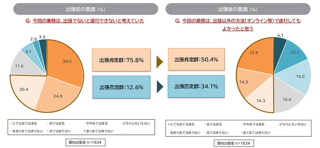1. 出張前に出張を前向きにとらえている層は75.8%。一方、出張を終えた後に、出張を前向きにとらえている層は50.4%に低下。