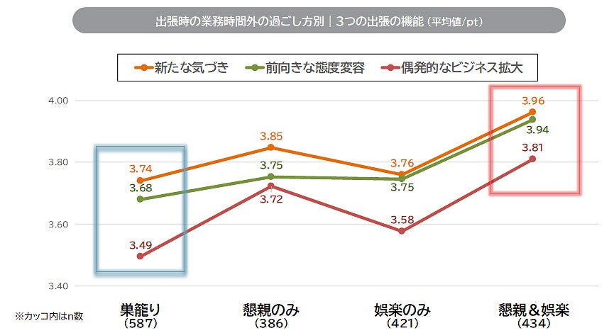 8. 出張業務外の過ごし方について、4群(「巣篭り」「懇親のみ」「娯楽のみ」「懇親&娯楽」)で3つの出張機能(「新たな気づき」「前向きな態度変容」「偶発的なビジネス拡大」)の度合いを比較した。いずれも「巣籠り」群で最も低く、「懇親&娯楽」群で最も高い傾向。