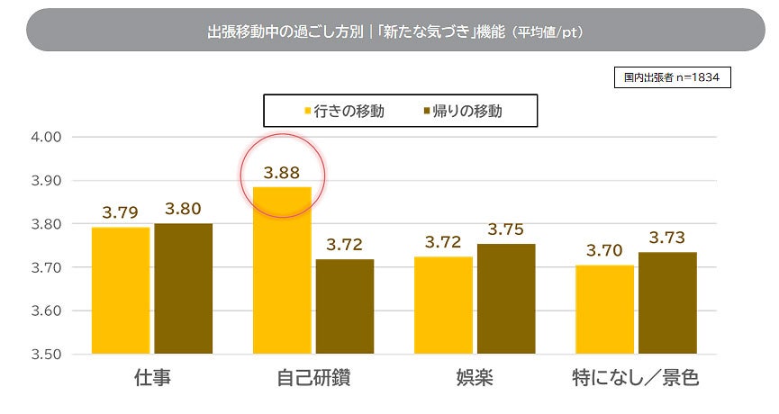 6. 出張移動中の過ごし方別に「新たな気づき」機能(新しいアイデアや考え方が生まれる/仕事における学びがある)の度合いを比較した。行きの移動中に「自己研鑽」を行っている人ほど「新たな気づき」機能のスコアが高い傾向。