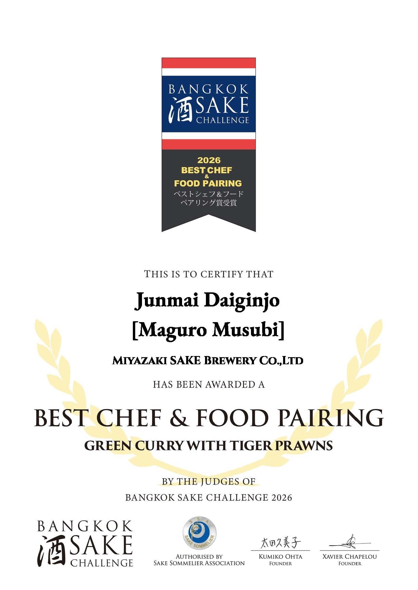 株式会社穴太ホールディングス(本社:千葉県木更津市、代表取締役:戸波亮)が運営する千葉県君津市の老舗酒蔵・株式会社宮崎酒造店(以下当社)は、2026年3月21日にバンコクで開催された国際日本酒コンペティション『バンコク酒チャレンジ2026』において、「純米大吟醸 サーモン結び」「純米大吟醸 まぐろ結び」の2銘柄で金賞を受賞。さらに「まぐろ結び」は、バンコクの一流シェフが選ぶ特別賞「ベストシェフ&フードペアリング賞(Green Curry with Tiger Prawns部門)」にも選出され、3冠を達成しました。