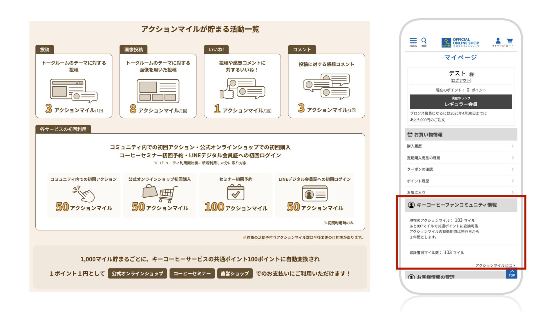 また、マイルは一定数貯まると「キーコーヒー公式オンラインショップ」「コーヒーセミナー」「LINEデジタル会員証」で使える共通ポイントに自動的に変換されるため、お客様のコミュニティサイト内の活動を促進しています。
