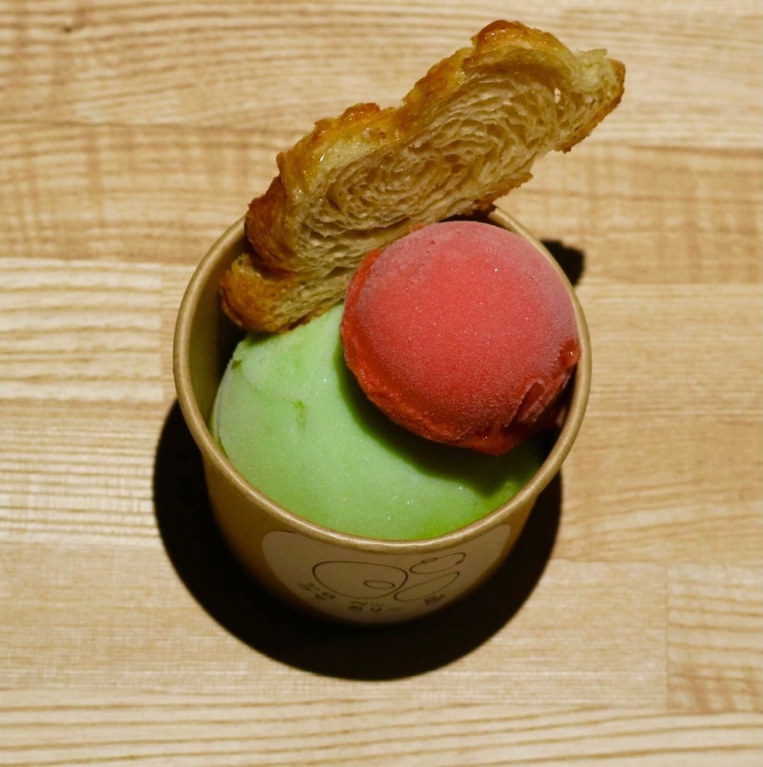 “ガイアナカイマントカゲ”と、”はらぺこあおむし”に共通する「赤い顔と緑の体」をイメージしたキウイとブラッドオレンジのシャーベットです。
