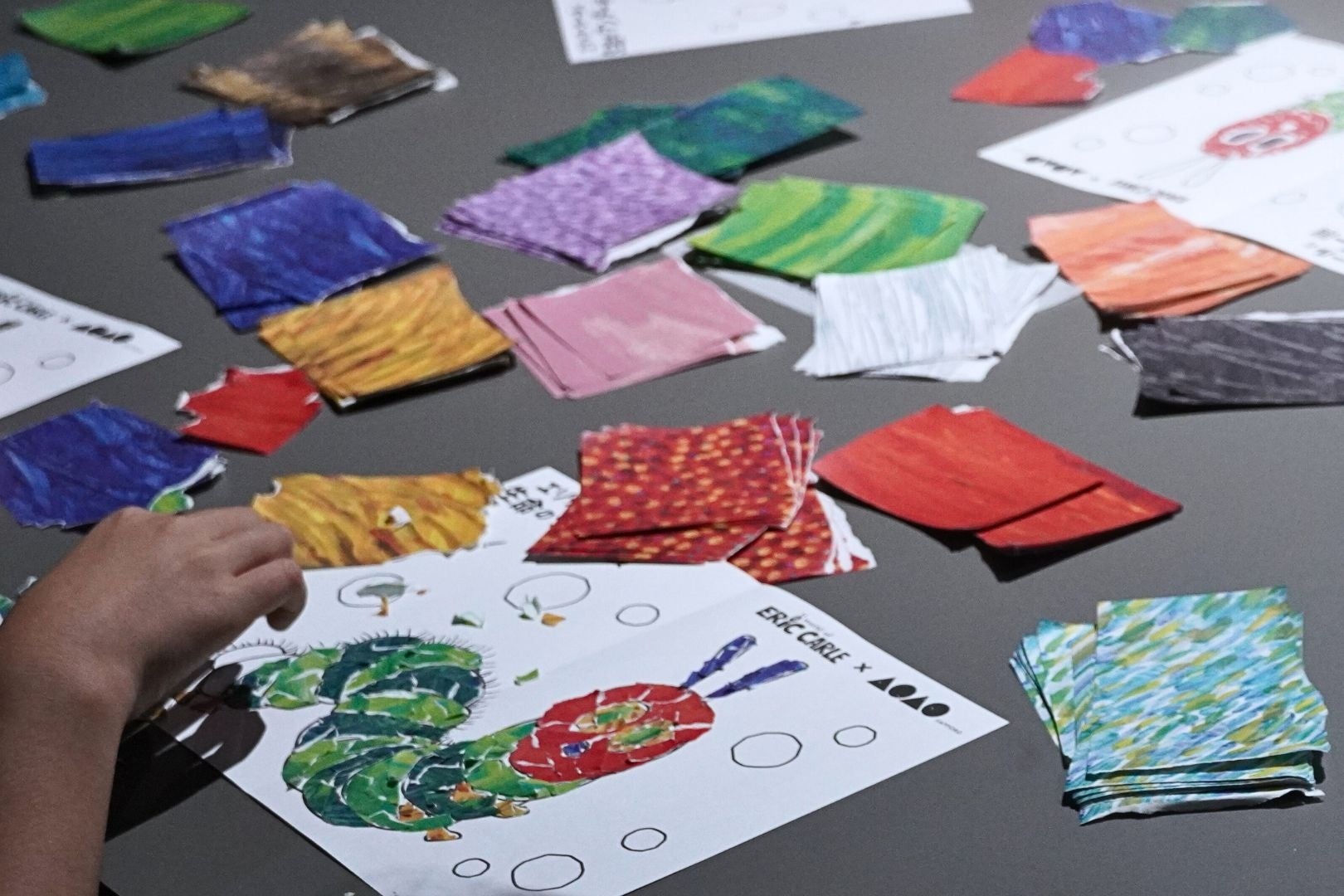 また、“赤い顔と緑の体”が特徴的なエリック・カールの作品を使った体験プログラム「はらぺこあおむしの貼り絵であそぼう!」を地元の子どもたちに先行体験してもらい、“赤と緑”をテーマにした「赤と緑のはらぺこトカゲシャーベット」などの試食も行いました。