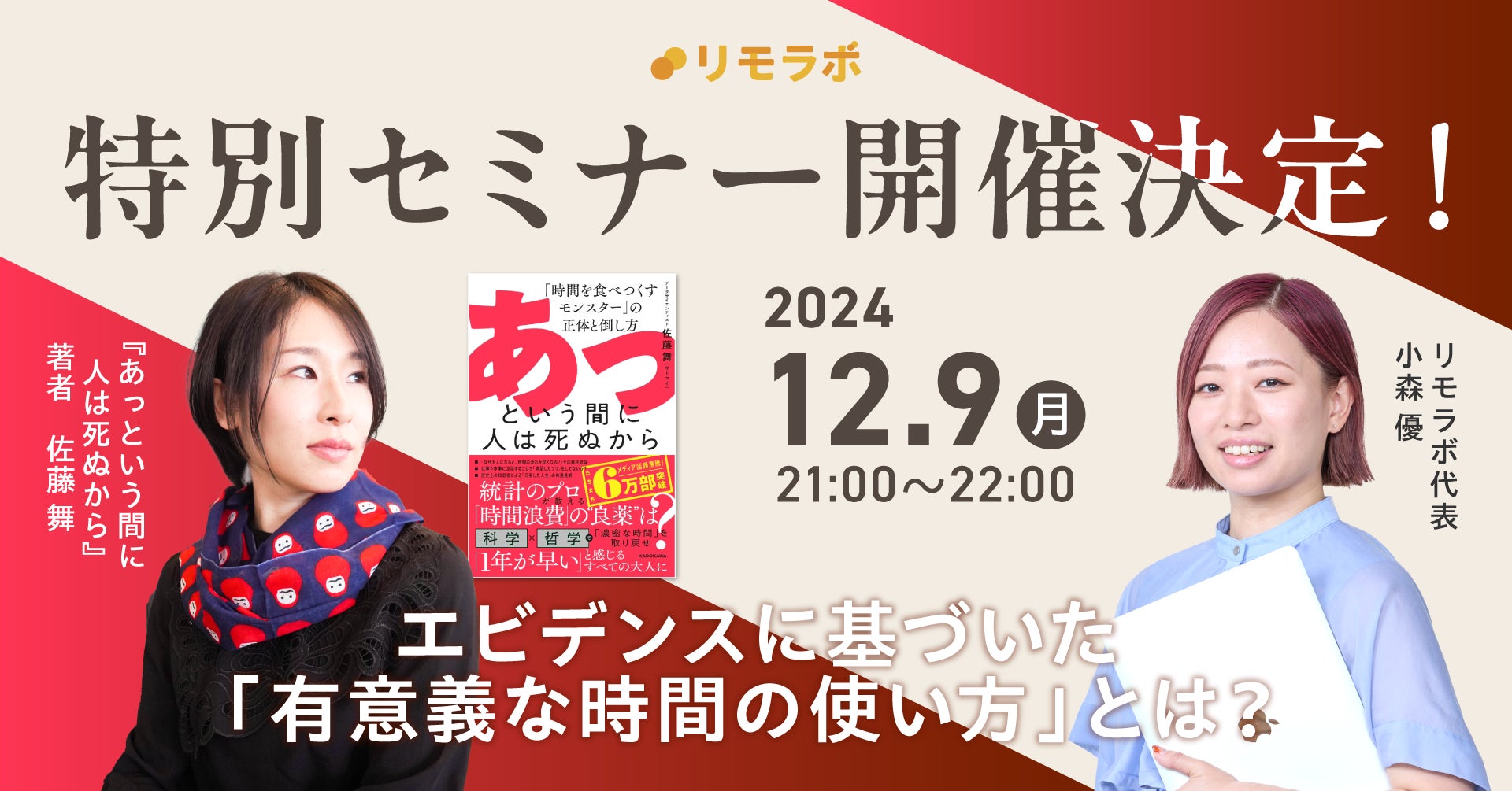 「女性のキャリアをシームレスに」の実現に向けて個人向けリモートワーク実践スクール事業「リモラボ」を運営する株式会社リモラボ(東京都渋谷区、代表取締役 佐伯正邦、以下「リモラボ」)は、『あっという間に人は死ぬから』著者である合同会社デルタクリエイト代表 佐藤 舞(サトマイ) 氏をゲスト講師に迎え、書籍の内容を元に、有意義な時間の使い方についての特別セミナーを2024年12月9日(月)に開講いたします。