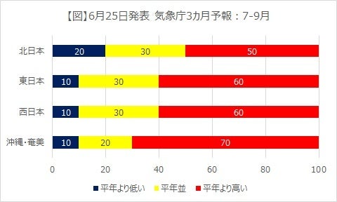 そして6月25日に発表された3ヶ月予報(右図:気象庁3ヶ月予報を基にヤマモリ㈱作成)では、北日本~沖縄・奄美に至るまでどの地域でも平年よりも気温が高くなることが予想されており、今年の夏は昨年に引き続き酷暑と呼ばれる夏になりそうです。