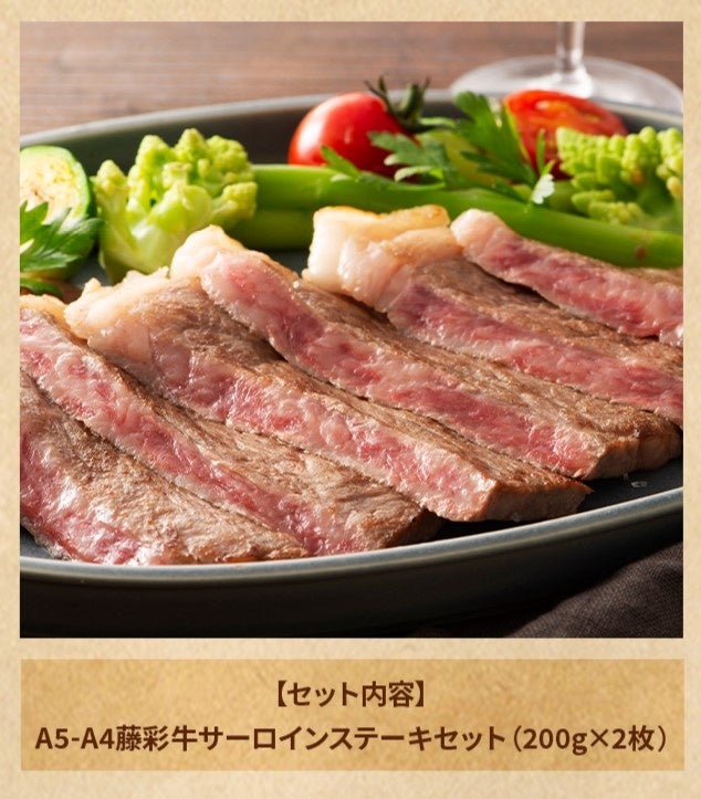 最高級格付けのA5-A4ランクのサーロインステーキのセット。フジチクオリジナルブランドの黒毛和牛「藤彩牛」はフジチクのこだわりが詰まった商品できめ細かな肉質と隅々まで入った霜降りの深い味わいが食通も唸らせる逸品