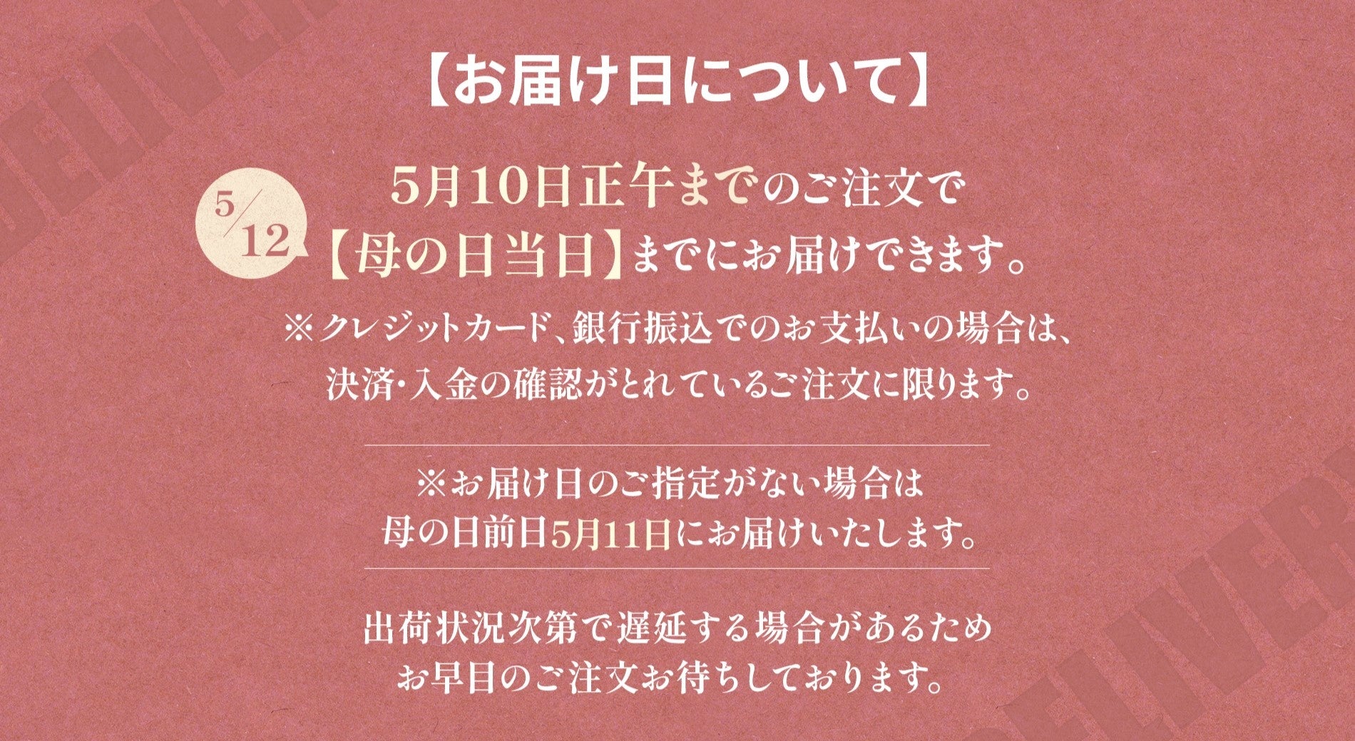 受付開始の4月1日~5月10日正午までにご注文で母の日当日の5月12日にお届け可能です。