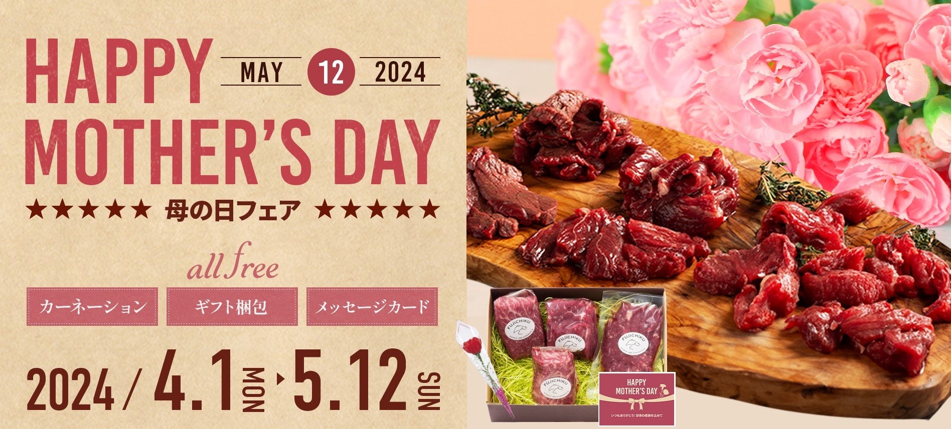 株式会社フジチク(本社:熊本県菊池郡菊陽町久保田727-1)のオンラインショップ(URL:https://www.fujichiku-shop.jp/)で2024年4月1日から「母の日」フェアを開催いたします。母の日限定の馬刺しのセットや母の日ならではの特別仕様でお届け致します。