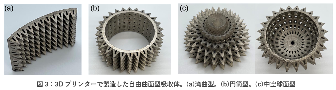 また、本研究の3Dプリンターを使った作製方法は、吸収体の大面積化が容易であることに加え、湾曲・円筒・球面などのさまざまな形状を作製できるという特徴を持ちます(図3)。このような吸収体を作製することで、特定の方位から伝搬するテラヘルツ波を高効率に検出できるようになります。この特徴を利用すると、テラヘルツ波の絶対強度だけでなく、離れた位置のアンテナから放射されるテラヘルツ波の分布や広がり幅の測定などが可能になると期待され、テラヘルツ波検出技術のさらなる高度化につながります。