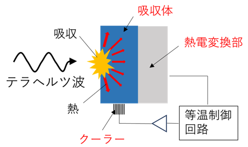 テラヘルツ波の絶対強度を測定するセンサー。テラヘルツ波を吸収して熱に変換する吸収体と熱検出部から構成される。以下に示す図は等温制御型パワーセンサーの基本構成例で、吸収体、熱電変換部、クーラーからなる。テラヘルツ波が吸収体に照射されると、吸収体で変換された熱により吸収体の温度が上昇する。この温度上昇を熱電変換部で電気信号に変換し、それをもとに上昇した温度分の電力をクーラーに与え、吸収体の温度を等温に保つ。クーラーに与えた直流電力からテラヘルツ波の強度の絶対値を求める。