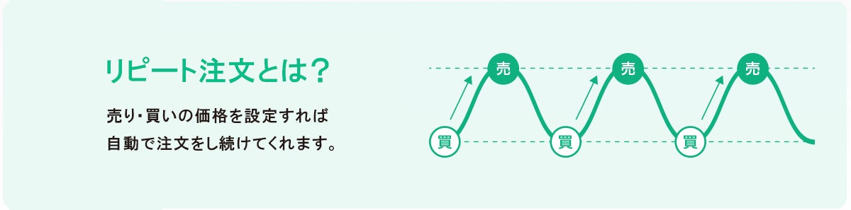 自動売買機能とは、一定のルールに基づいて24時間売買を繰り返す取引手法のことです。当社が提供開始する自動売買機能は、100円から取引できるため、自動売買機能を活用したことがない方でも手軽に始めやすいことが大きな特徴です。自動取引の手法としては、注文内容をあらかじめ設定し自動で取引を行うリピート系注文で、レートの上限・下限や売買の値幅など、シンプルな設定でお取引を開始することができます。一定値幅で価格が上下を繰り返すようなレンジ相場でも、自動的に繰り返し利益を積み上げていくことが期待できます。