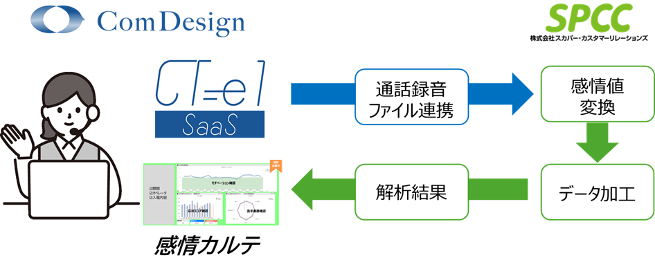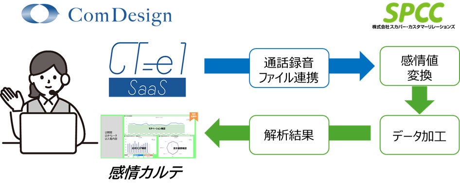 コンタクトセンター向けクラウド型CTI「CT-e1/SaaS」を月額サービスで提供する株式会社コムデザイン(東京都千代田区平河町、代表取締役社長:寺尾憲二)は、株式会社スカパー・カスタマーリレーションズ(本社:東京都品川区、代表取締役社長 松谷浩一、以下 SPCC)が提供するコンタクトセンター向け感情解析データ活用支援サービス「感情カルテ」との連携検証が完了しました。両社は本成果を基盤に、2026年1月のサービス提供開始を目指して、機能開発と協業を進めてまいります。