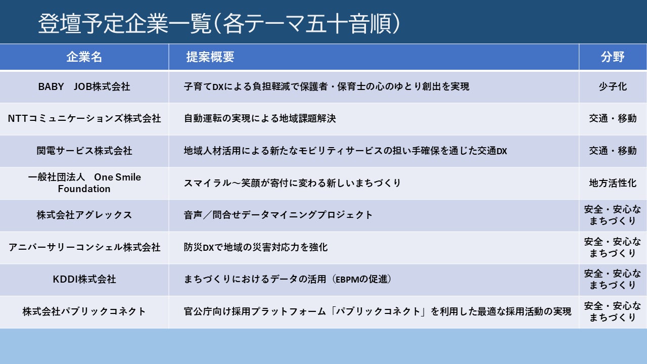 本イベントでは、会員企業から課題解決に資するソリューションを募集し、市町村からのアンケート結果に基づき選定された8つのソリューションを、それぞれの会員企業よりプレゼンテーションしていただきます。