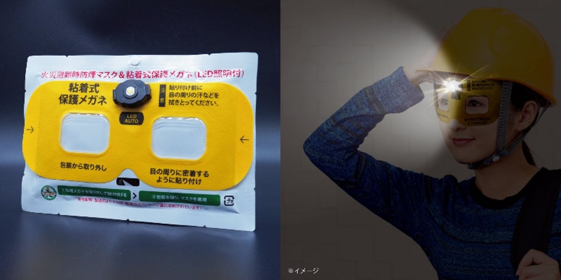 サイズ調節も不要で、上から眼鏡をかけることもできるので、どなたでも素早く簡単にご使用いただけます。フィルムから剥がすと自動で点灯するLEDライト付きで、停電時や火災の煙による視界不良の中でも安全に退路を確保できます。