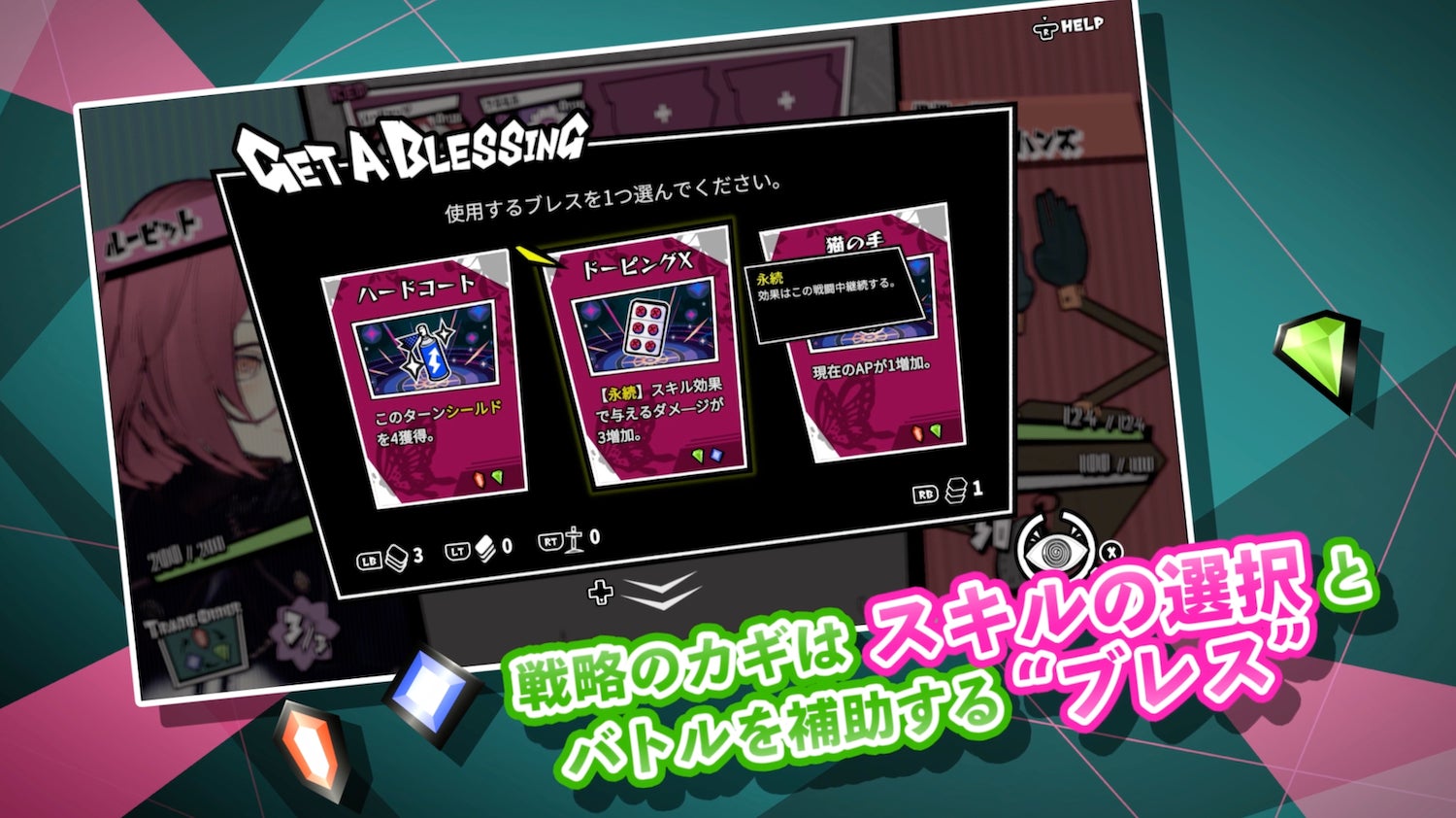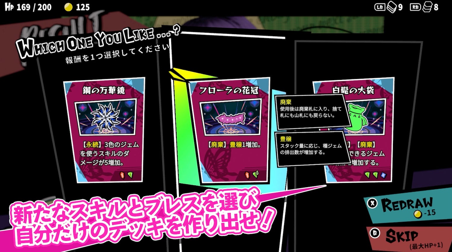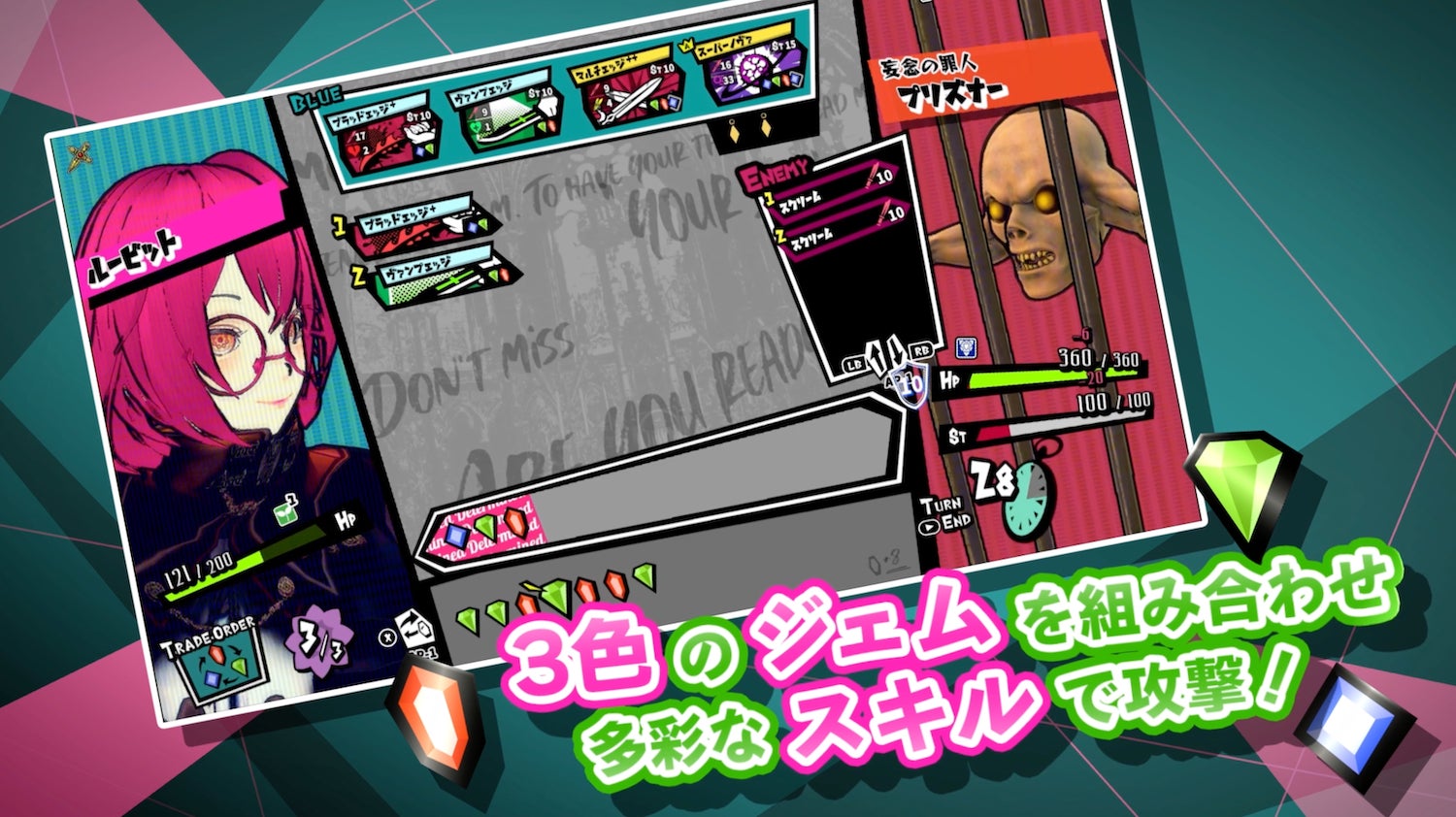 本作は最大火力を出すためのデッキ構築力と、制限時間内にコンボを繋ぐための瞬時の判断力が求められる、奥深さと爽快感が両立したデッキ構築型ローグライトです。コンボが繋がれば繋がるほどスキルのダメージが上がっていき、気持ち良さを味わえる戦闘システムが何より特徴的です。ランダムに生成されるダンジョンのなかで、攻撃手段の“スキル”、バトルを補助する要素となる“ブレス”を集め、最深部に潜むボスを倒すのが目的となります。より多くのコンボを繋ぐため、スキル発動に必要なジェムの色を自分好みにカスタマイズすることで、理想のデッキ構築に近づいていきます。ボス戦にて大量コンボが決まった時に味わえる快感が特徴的なゲームとなっております。
