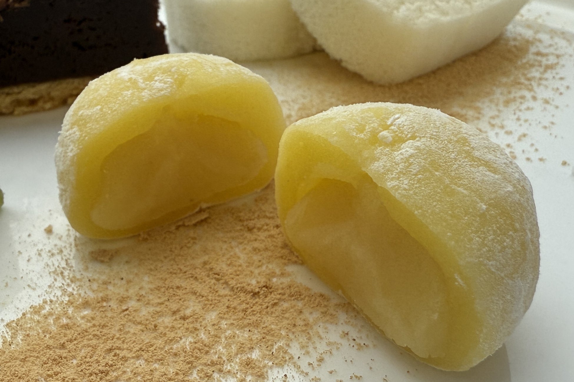 柚子果皮を練り込んだ餡と、柚子をイメージした黄色い生地が特徴のミニサイズの大福です。白餡の甘さに柚子の風味が感じられます。和風デザートプレートやパフェのトッピングとしてもご利用いただけます。