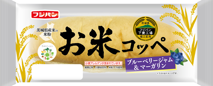 茨城県産米の米粉を使用したコッペパンに、ブルーベリージャムとマーガリンをサンドしました。