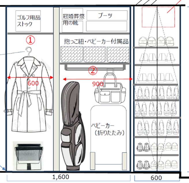さらに本物件では、クローゼットとランドリールームを回遊できる家事効率の高い動線計画を採用するほか、整理収納コンサルティング会社であるインブルーム株式会社の監修による効率的な収納設計(左図参照)を導入しています。また、テレワークやSOHO利用など多様化する働き方のニーズに応えるワークスペースも設けます。