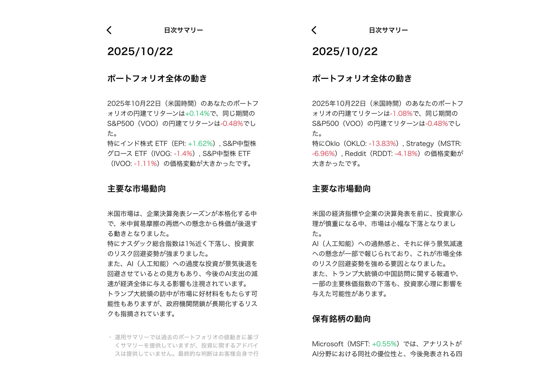 例えば、同じ2025年10月22日のAIサマリーでも、ETF中心に国際分散投資をしているポートフォリオをもつお客様と、グロース株中心に投資されているお客様のサマリーでは表示内容が大きく異なります。NASDAQの下落が目立ったのこの日、前者では新興国株ETFのパフォーマンスが強調される一方、後者は個別のグロース株の下落や銘柄関連のニュースが届けられます。