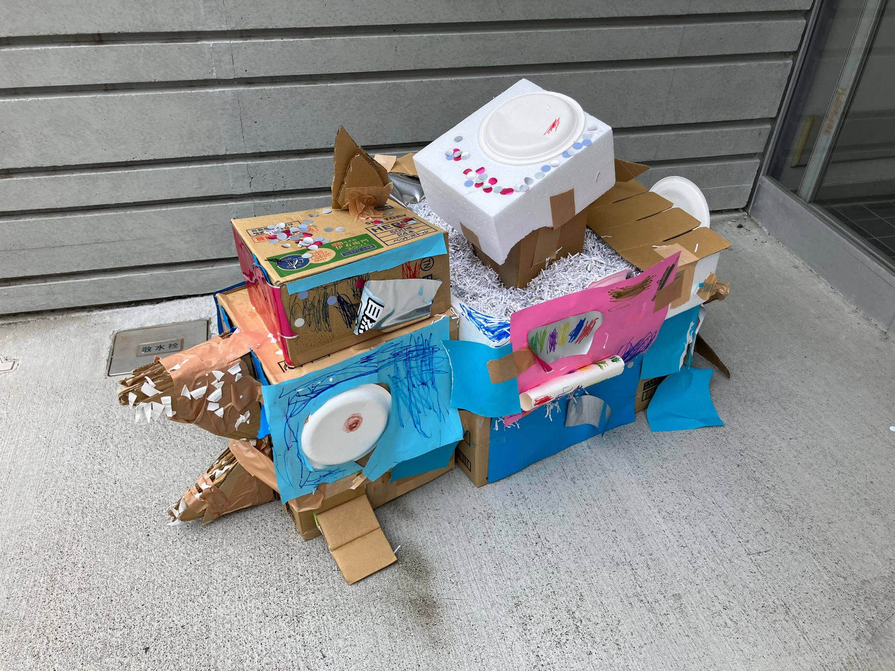調査方法は、観賞魚飼育水槽を設置している幼稚園と、未設置の保育園に通う年長児を対象に実施。両園で保育中の一斉活動として、魚の秘密と題した紙芝居形式の説明会を開催。説明会実施後に5名ごとのグループに分かれて、廃材を使った魚の立体物を製作してもらいました。説明会は7月にエラと顔の話、9月にウロコと耳の話、10月にヒレと泳ぎ方の話を行い、3回にわたる製作活動によって完成した作品からアクアリウムによるSTEAM教育への有効性を検討しました(なお、本研究は、調査を行った幼稚園、保育園の園長先生に承諾を得たうえで実施しています)。