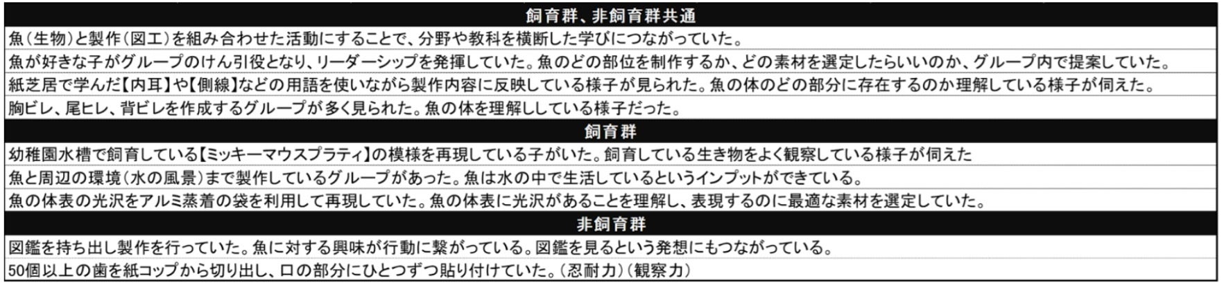 これらのことから、幼児期にアクアリウムと触れ合う事は興味・関心を引き出すとともに、科学的な思考や観察力を育むために有効であることが示唆されました。