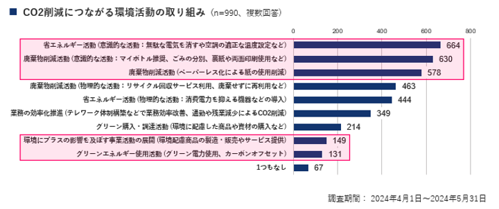 一方で、「グリーンエネルギー使用活動 (グリーン電力使用、カーボンオフセット)」は131回答、「環境にプラスの影響を及ぼす事業活動の展開(環境配慮商品の製造・販売やサービス提供)」は149回答と取り組みが少ない結果となりました。