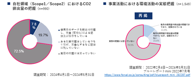 環境活動を行ううえで大切な事は自社のCO2排出量を可視化し、月単位もしくは年単位での差分を分析することです。環境活動に取り組んでいるものの、数値で把握できていない企業は、どのように把握すればよいか分からない、把握するための人的リソースがない、などの要因があると推察されます。必要に応じて環境活動の取り組みを可視化するITツールの活用、外部委託などの手法について検討するべきだと捉えられます。