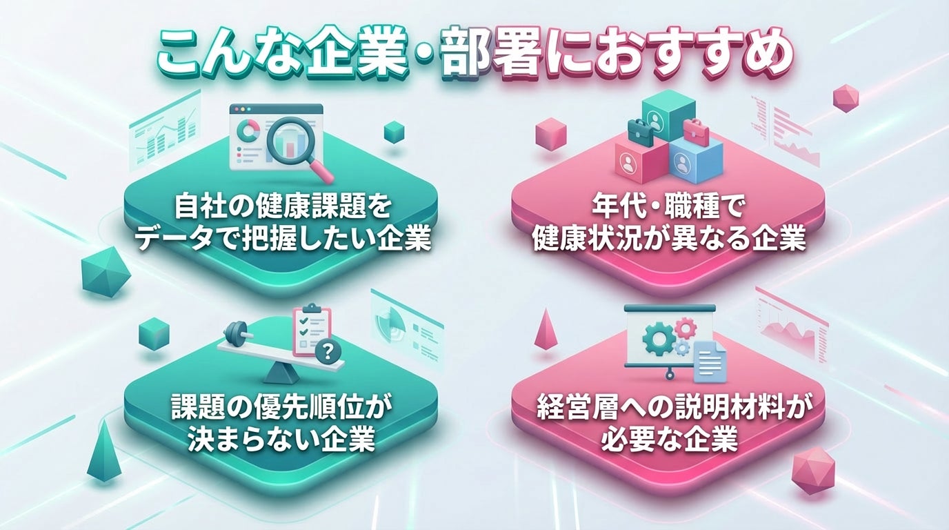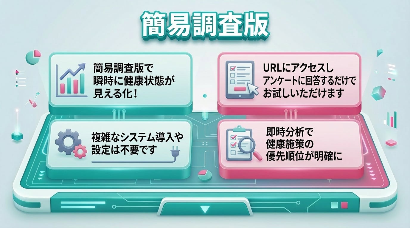 健康施策の前提となる現状把握が曖昧だと、打ち手が分散し、工数だけが増えがちです。本サービスは18設問のショートサーベイで、組織の状態を短時間でスクリーニングし、優先順位付けの起点をつくります。まずは現状を可視化し、投資対効果の高い施策設計へつなげるきっかけとして、簡易調査版をリリースいたします。