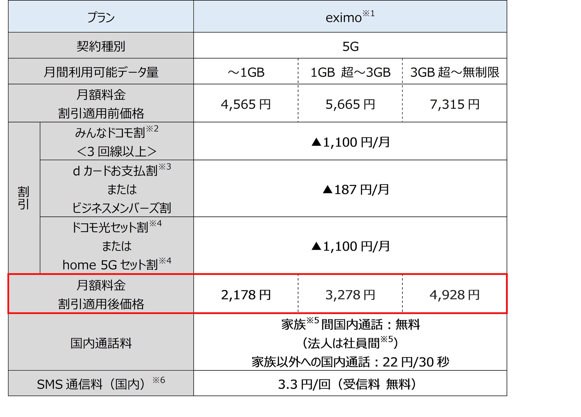 「dカードお支払割(※2)」(▲187円/月)、「みんなドコモ割」(最大▲1,100円/月(※3))、「『ドコモ光セット割(※4)』または『home 5G セット割(※4)』」(▲1,100円/月)の適用で、1GBまでは2,178円/月、1GB超から3GBまでは3,278円/月、3GB超は4,928円/月でご利用いただけます。その他、「ファミリー割引」のご契約で家族間(※5)での国内通話が無料となり、ご家族でお得にご利用いただけるプランです。