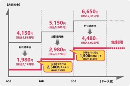月間のデータ利用量に応じて三段階に月額料金が変わる料金プランです。