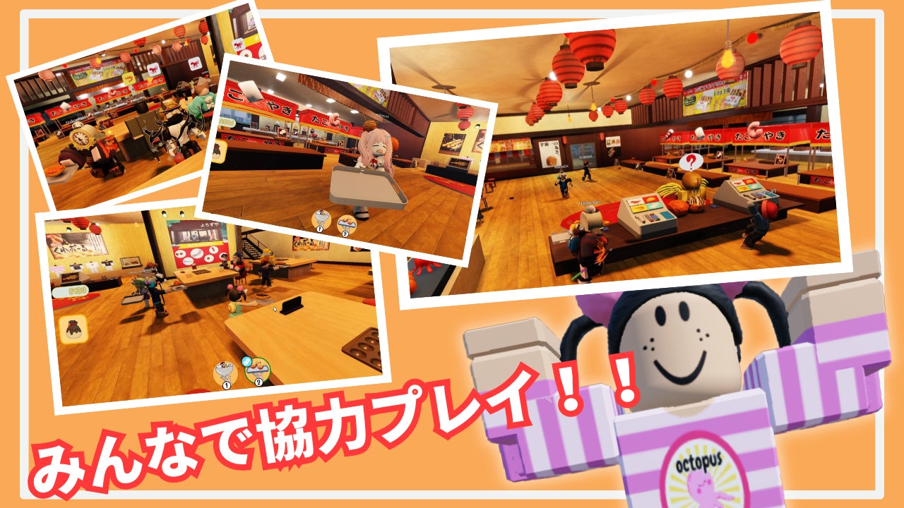 ゲームでは、ご来店されたお客様(NPC)の注文に合わせてたこ焼きを焼き、お席に届けていただくことで、本ゲーム内の独自通貨を獲得することができます。また運営は友達同士で協力して遊ぶこともできます。