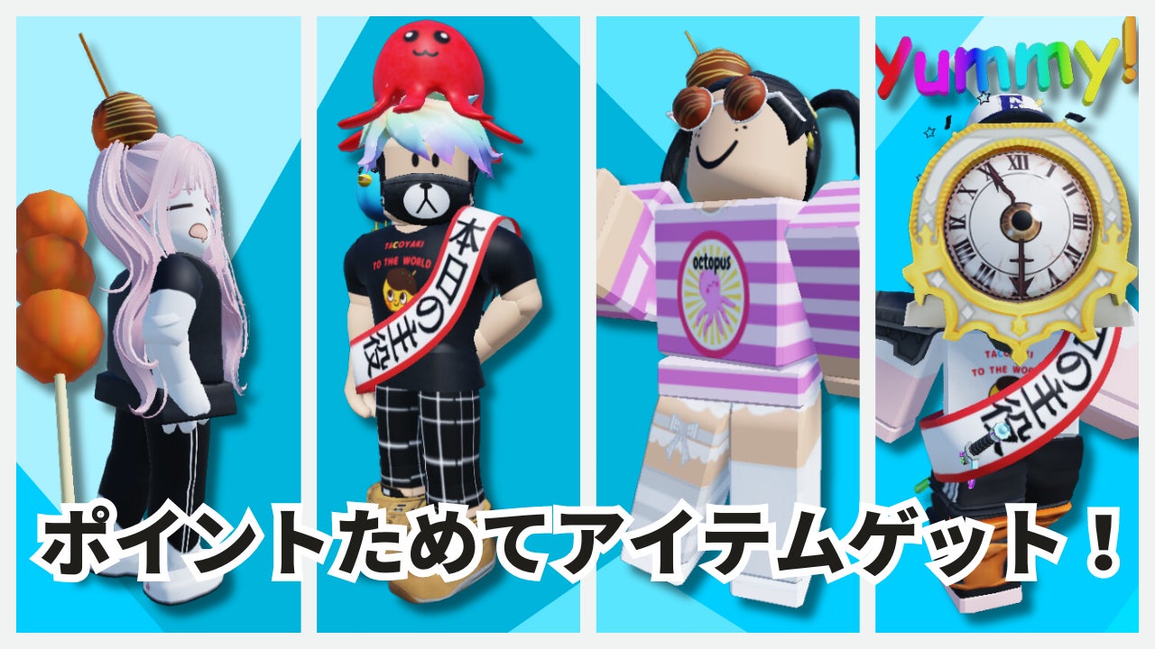貯めたお金で、マップ内にあるショップにて、たこ焼きをイメージしたオリジナル着せ替えアイテムと交換できるほか、ロブロックスのゲーム内通貨であるRobux(ロバックス)で購入できる限定アイテムも購入できます。店内だけでなく、昼と夜で変わる街の風景や、道路や公園にあるギミックもお楽しみください。
