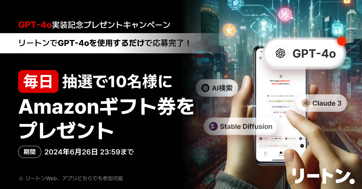 また正式リリースを記念し、抽選でAmazonギフト券が毎日当たる 「GPT-4o」実装記念キャンペーンを開催いたします。