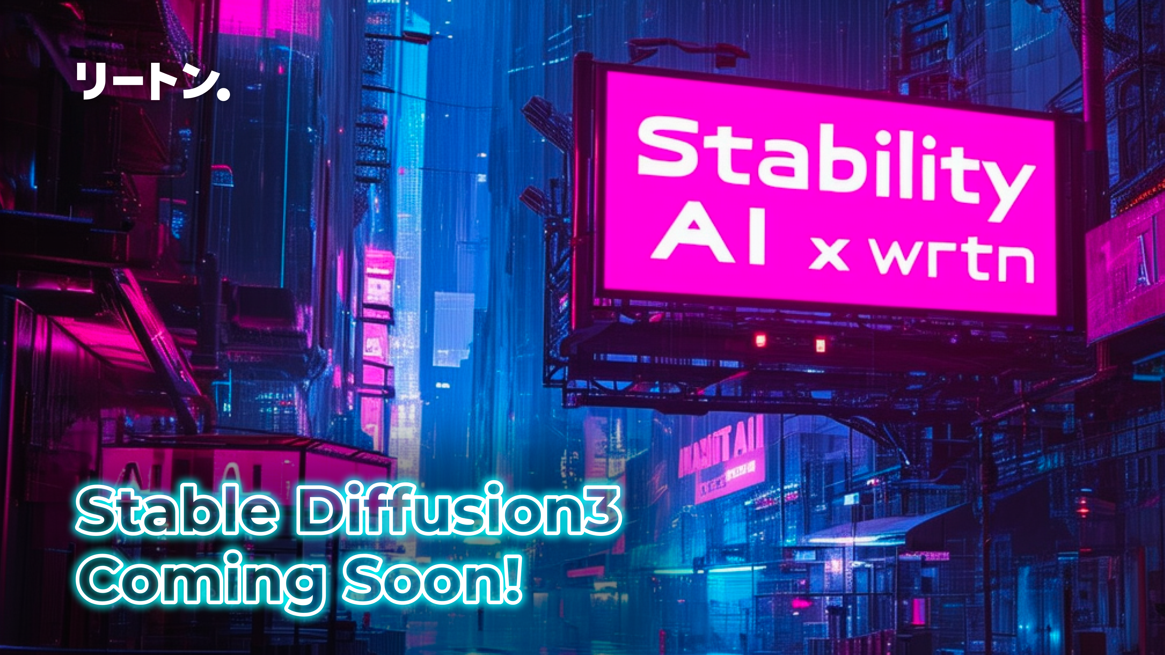 「GPT-4o」正式リリースのお知らせに続き、リートンでは近日中にWeb版及び公式モバイルアプリにおいて、Stability AIが今年4月に発表した最新画像生成AIモデル「Stable Diffusion 3」の実装を予定しております。以前までのモデルよりも更にクオリティの高い画像生成が可能になっていると同時に、これまでの画像生成AIでは難しかった「画像内へ正確に文字を表示させる」ことが可能になっています。