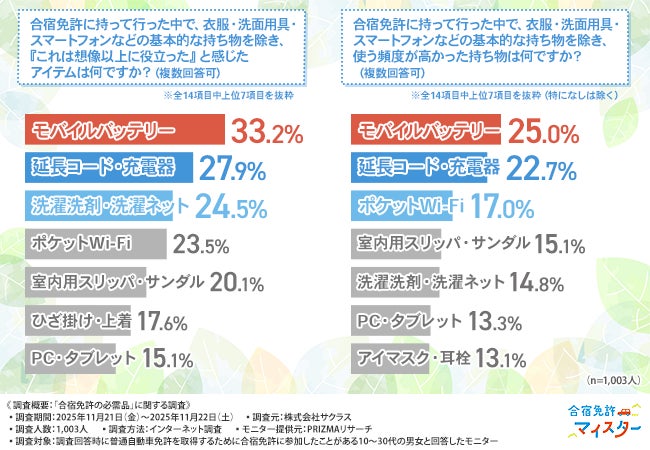 「合宿免許に持って行った中で、衣服・洗面用具・スマートフォンなどの基本的な持ち物を除き、『これは想像以上に役立った』と感じたアイテム」を尋ねたところ、『モバイルバッテリー(33.2%)』が最多で、『延長コード・充電器(27.9%)』『洗濯洗剤・洗濯ネット(24.5%)』となりました。