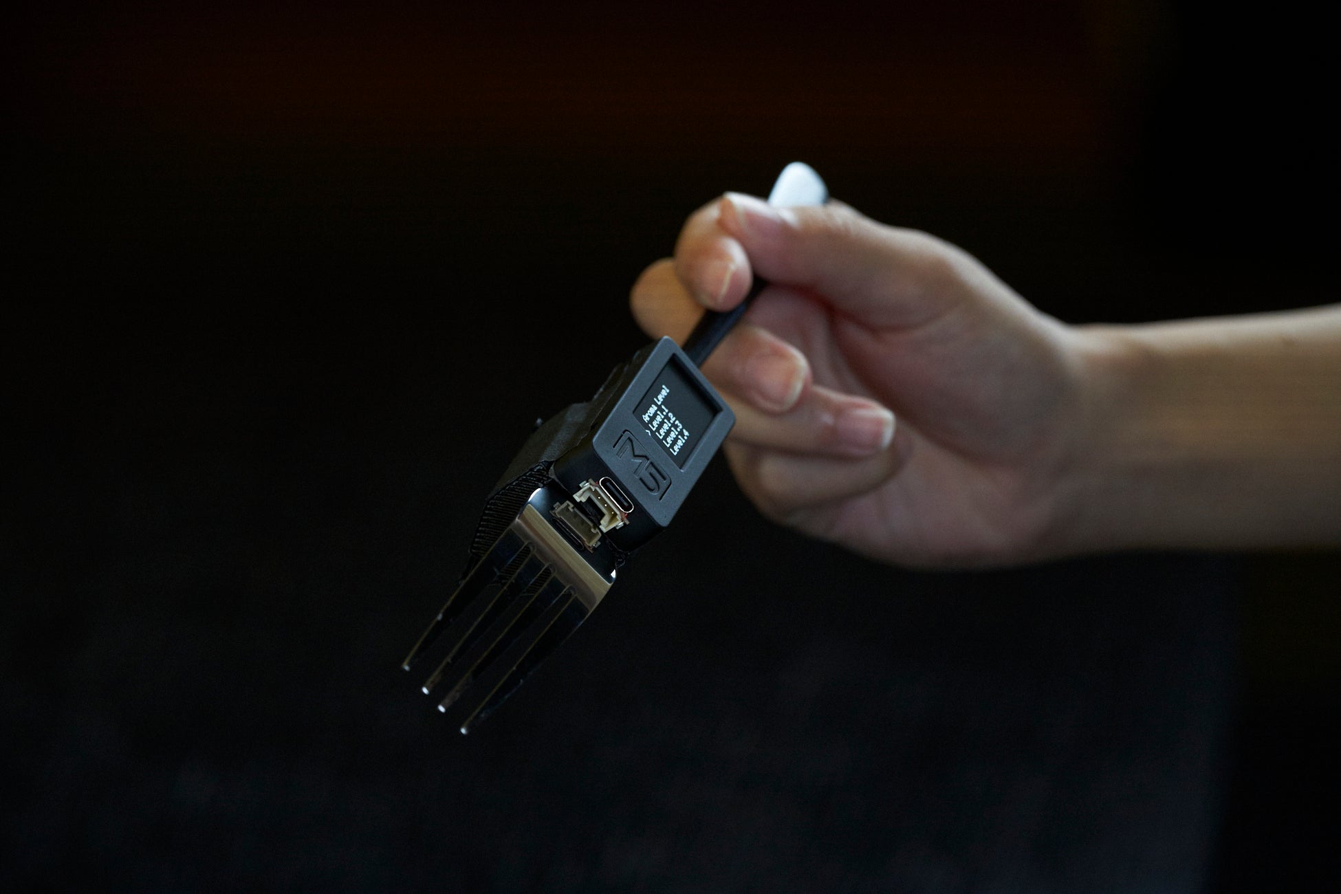 ニンニクの香りを発生させるデバイスを装着したフォーク。香りをコンピューターで制御する。TTTV3と組み合わせることで、ニンニクを使用しないペペロンチーノの食体験ができるなど、口臭を起こさずにニンニクを味わうことができる※8。