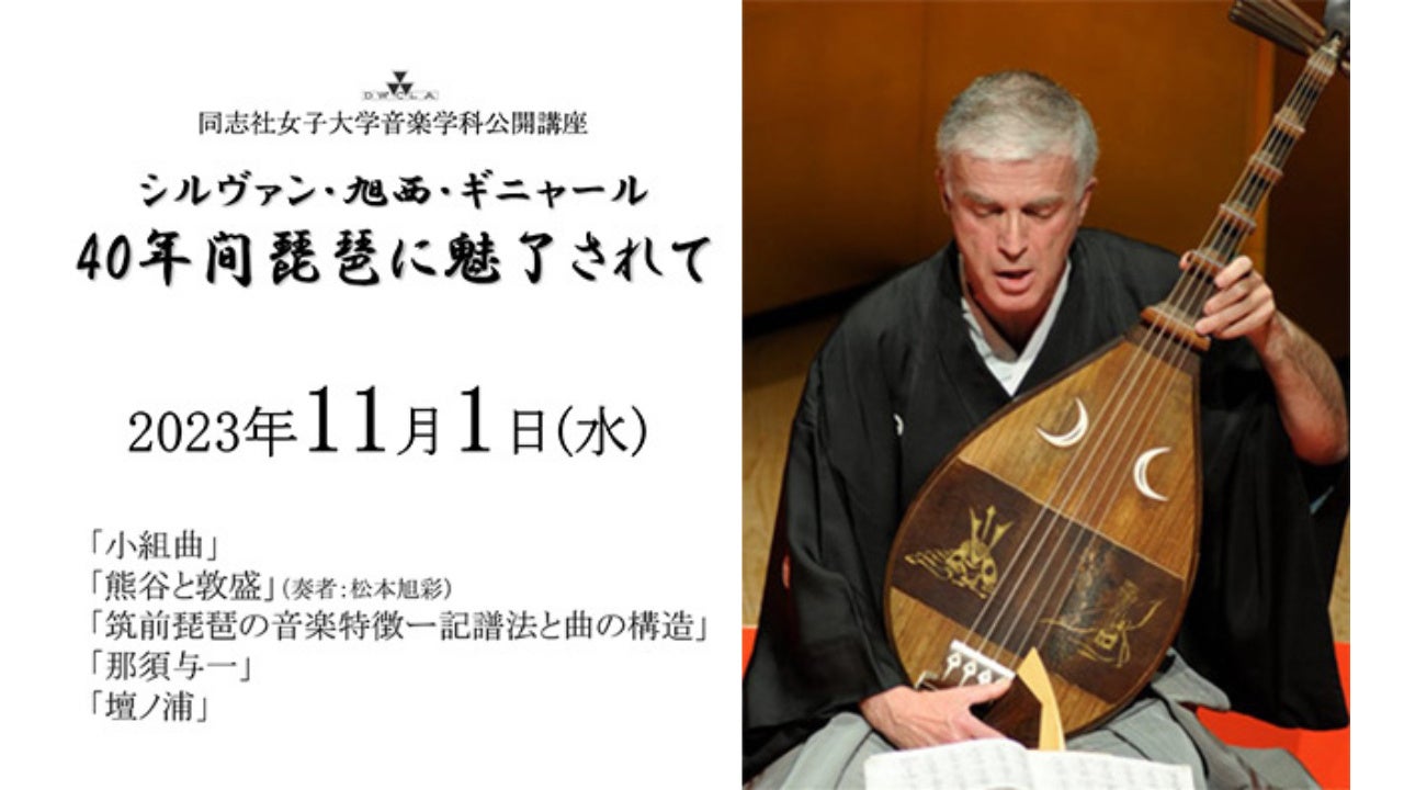 筑前琵琶奏者で大阪学院大学名誉教授の、シルヴァン・旭西・ギニャール氏を講師にお迎えし、琵琶の演奏とともに、筑前琵琶の音楽特徴についてご講演いただきます。
