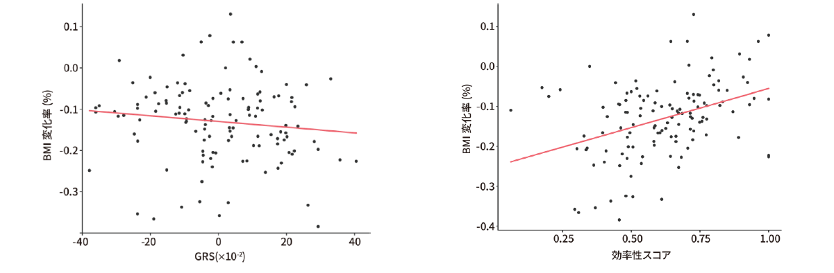 今回の解析では、GRSとプログラムの効果との間に関連を認めませんでした。言い換えると、現在の横断的なBMIに関するGRSの高低がプログラムの効果に影響するという根拠を認めませんでした。一方で、DEAにおいてGRSを入力変数として用いて計算した効率性スコアが低いと、プログラム前後のBMI変化率が大きいという関連が観察されました。GRS単独ではプログラムの効果との関連は認められませんでしたが、効率性スコアというGRSを加味したBMIの評価により、プログラムの効果がより得られやすい、あるいは得られにくい可能性のある集団が判別可能となり、この知見をRIZAPプログラムの最適化に応用できる可能性が示唆されました。